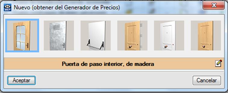 Se despliega el menú en el que aparecen los distintos “huecos” que podemos disponer: puerta de paso, carpintería exterior y hueco acristalado, aberturas y lucernarios. Ejecutamos el comando Puerta de paso y se abre un cuadro en el que debemos elegir el tipo de puerta. Con el botón de editar (lápiz) podremos elegir las dimensiones y características de las puertas.