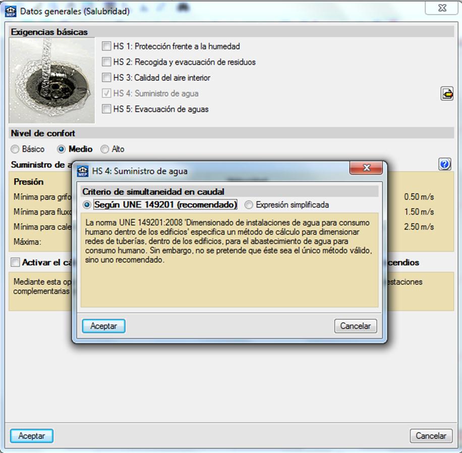 Seleccionaremos Nivel de confort medio. Al seleccionar este nivel de confort, se incrementa el caudal en caso de uso simultáneo de los aparatos, se aumentan las presiones mínimas y se disminuyen los valores máximos de velocidad y presión estipulados en CTE DB HS 4, con lo que se reducen las vibraciones en las tuberías. Como resultado, se incrementa el nivel de confort de los usuarios sin un encarecimiento excesivo de la instalación.