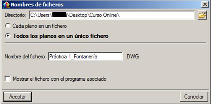 Al seleccionar imprimir todos, debemos especificar la ruta donde nos va a guardar los planos generados y si queremos tenerlos en ficheros separados o en un único fichero.